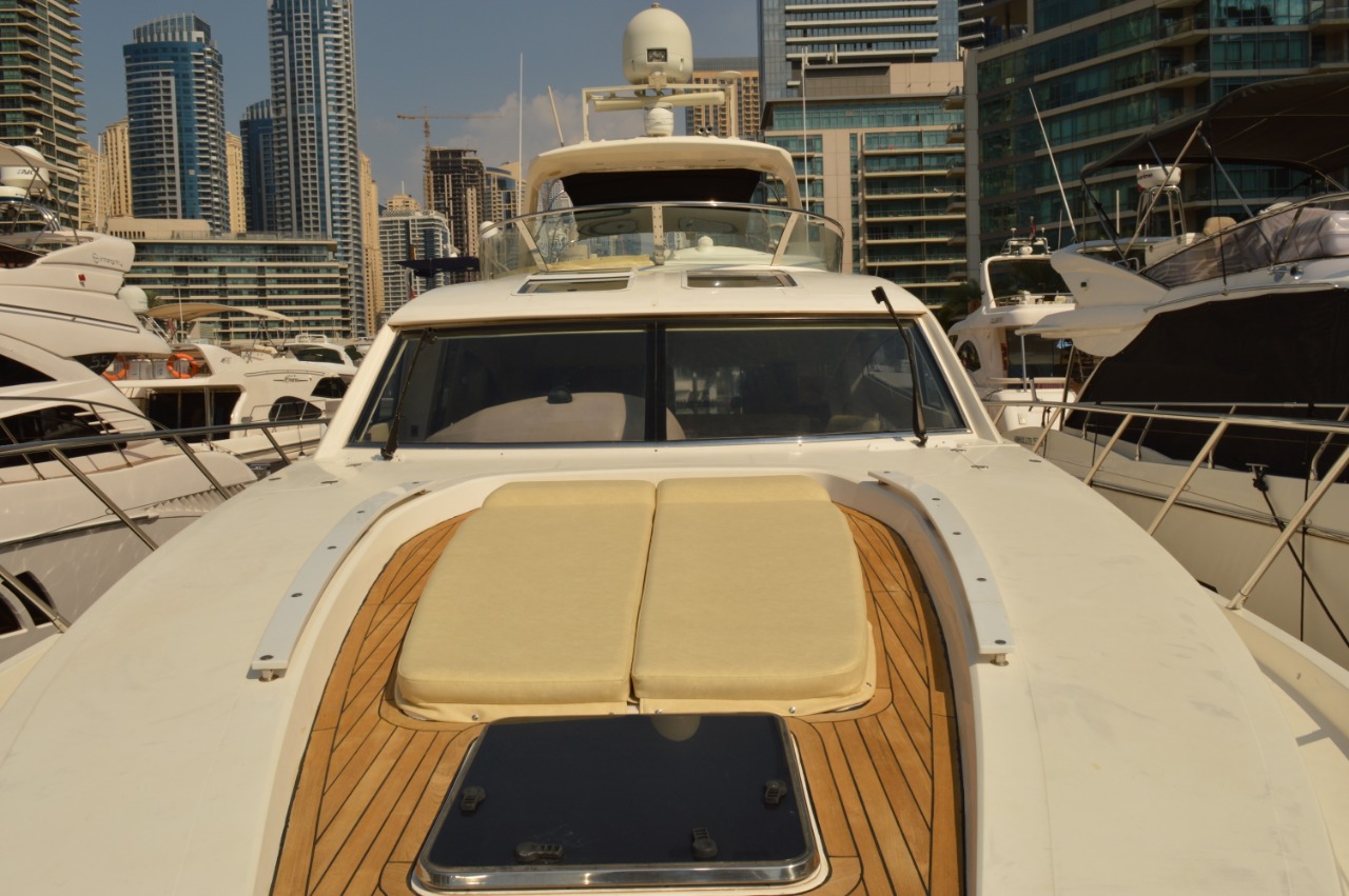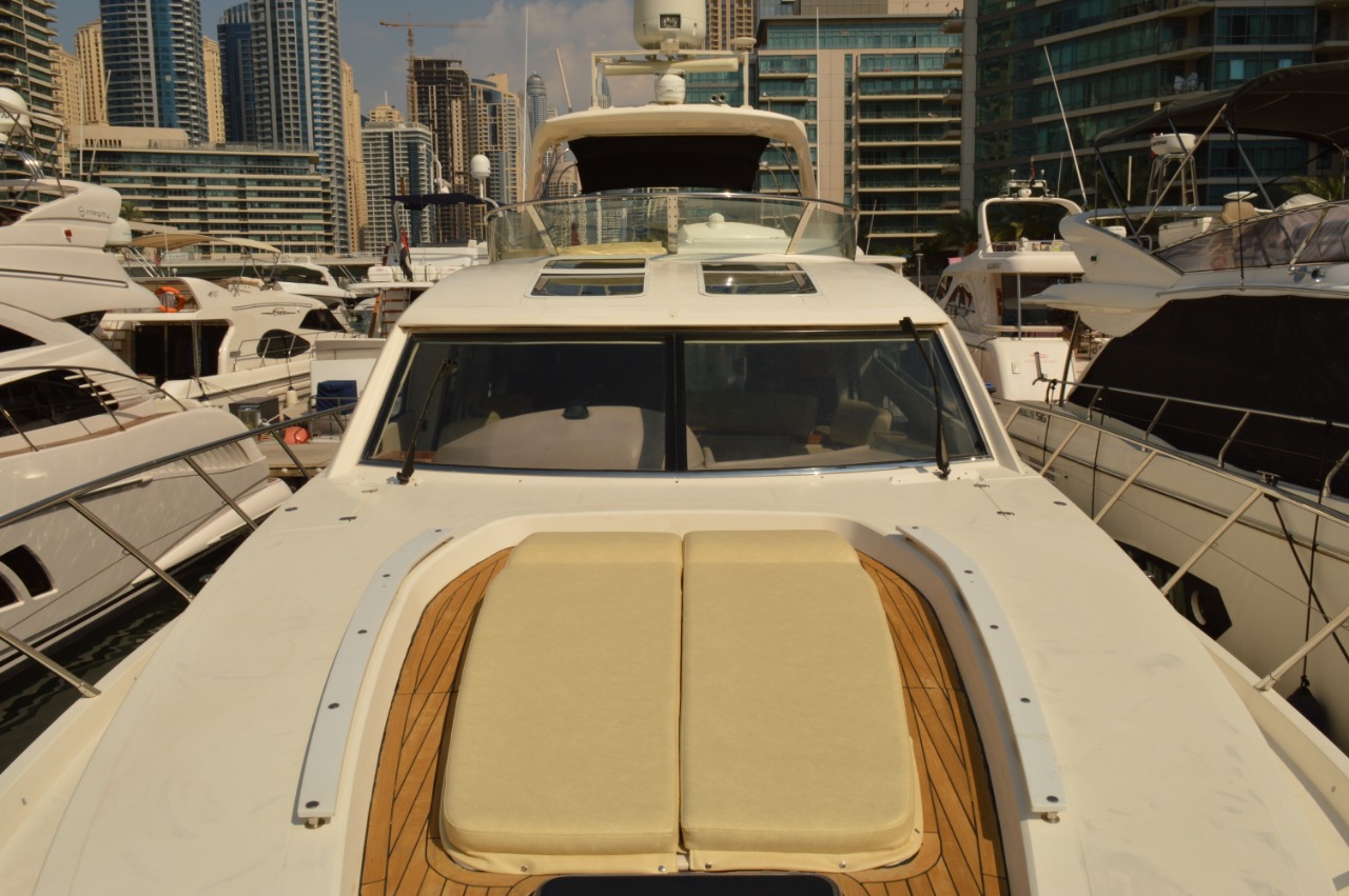 Sealine motor yacht available for private charters throughout Dubai Marina, offering three cabins which can comfortably accommodate up to 15 guests along with a dedicated crew of Three.